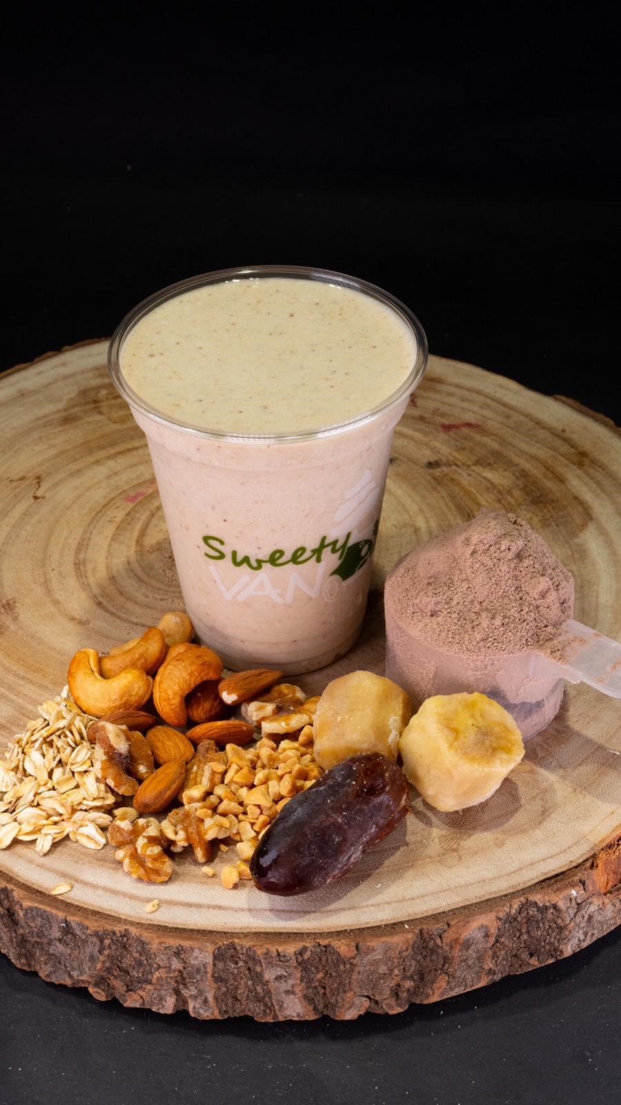 شيك حلڤونموز توت تمر مكسّرات شوفانשייק חלבון - בננה תות שקדים אגוזים פיסטוק שיבולת-שועל30₪